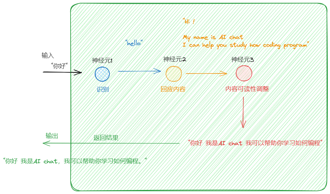 还要理解复杂语言,如果提问的是“写一段java代码实现打印hello world” 某个神经元肯定是要分析返回一段代码,并且代码符合要求,实现打印hello word。这需要更多的神经元,分析。“写一段” “Java代码” “打印” “实现”